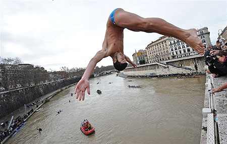 El Salto al Tíber: como es tradición, turistas y romanos asistieron ayer día 1 de enero al espectáculo tradicional que da la bienvenida al nuevo año en Roma: los espectaculares saltos desde el puente de Cavour a las frías aguas del Tíber.